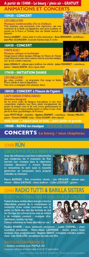 Un grand merci au public très nombreux, qui a partir de 15h s’est rassemblé autour de l’église : il a dansé sur des jigs, reels et autres valses, joué.e.s par le groupe alti-ligérien LES GRILLONS ; il a découvert la fusion entre musique celtique et musique burkinabé de MAFILA KO ; il a pu enfin apprécier l’énergie de LAZY GRASS STRING BAND et trinquer aux sons d’un bluegrass revisité et teinté de nuances méditerranéennes.