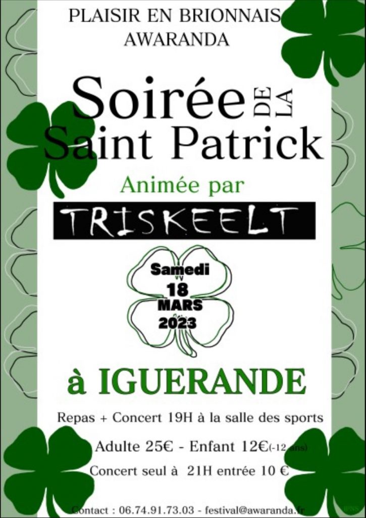 l’Association Plaisir en Brionnais (organisatrice du festival AWARANDA organisera samedi 18 mars une soirée SAINT PATRICK à Iguerande (salle des sports) dès 19h00